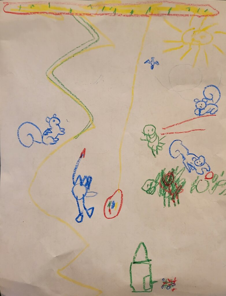 While out at dinner the other night, my son took to drawing a story on the back of his menu. He was particularly entranced by the end result and asked me to write out the story for him. Below is his story. While I helped with word choice and sentence structure, the characters and events are entirely his creation. Enjoy!